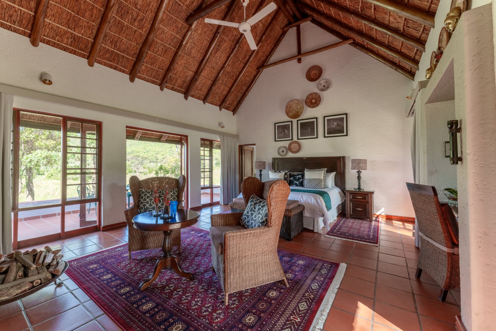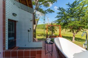 The Tlou Premier Suite is Thaba Metsi’s most exclusive sanctuary – a spacious retreat where comfort meets wilderness. A private fireplace sets the tone for tranquil evenings, while both indoor and outdoor showers, an open-air bath overlooking the river, and an expansive patio invite you to unwind in complete harmony with nature.